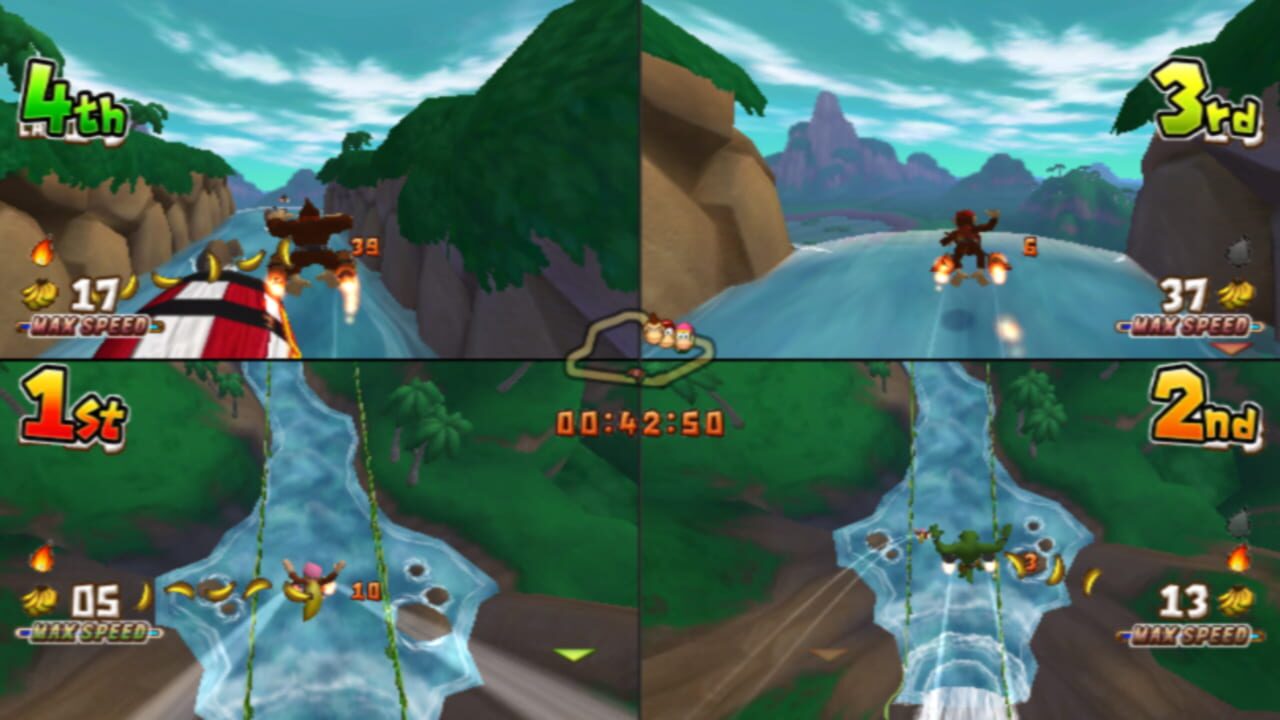 Donkey Kong Barrel Blast is a racing game where the player can handle the selected character using the Wii Remote and Nunchuk, replacing the DK Bongos that initially were to be used. To speed the player must shake the Wii Remote and Nunchuk simultaneously, lift them to jump and use the motion sensor to beat rivals and obstacles and using items, while the character will be guided by the route of the tracks, including curves of automatic. Players can learn to race at Cranky's flight school where Cranky gives 8 lessons on how to play the game, acceleration, use of elements and Wild Move.