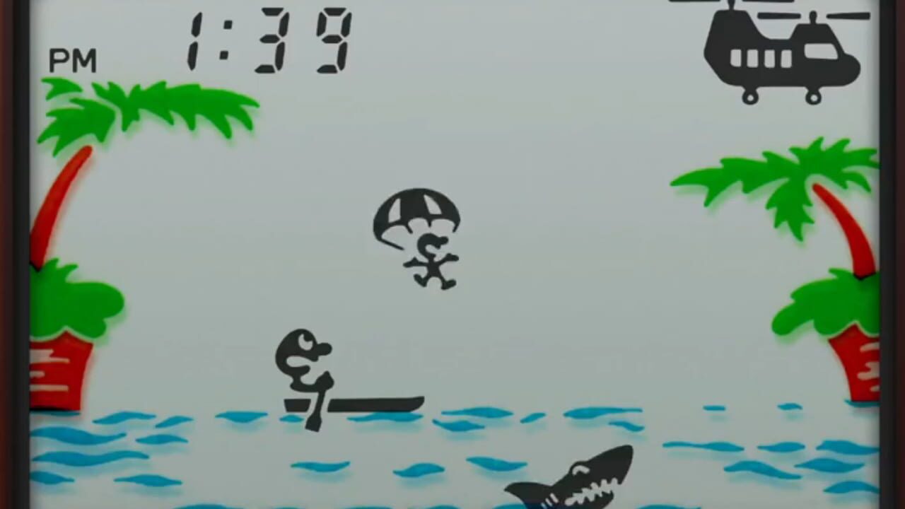 Parachute is a game for the Game & Watch where you have to save people from a helicopter and make them land in your boat. You will direct your boat under the person try and let them land safely. If they land in the water, a shark will come and eat them- if this happens three times you will lose and will have to start over.
