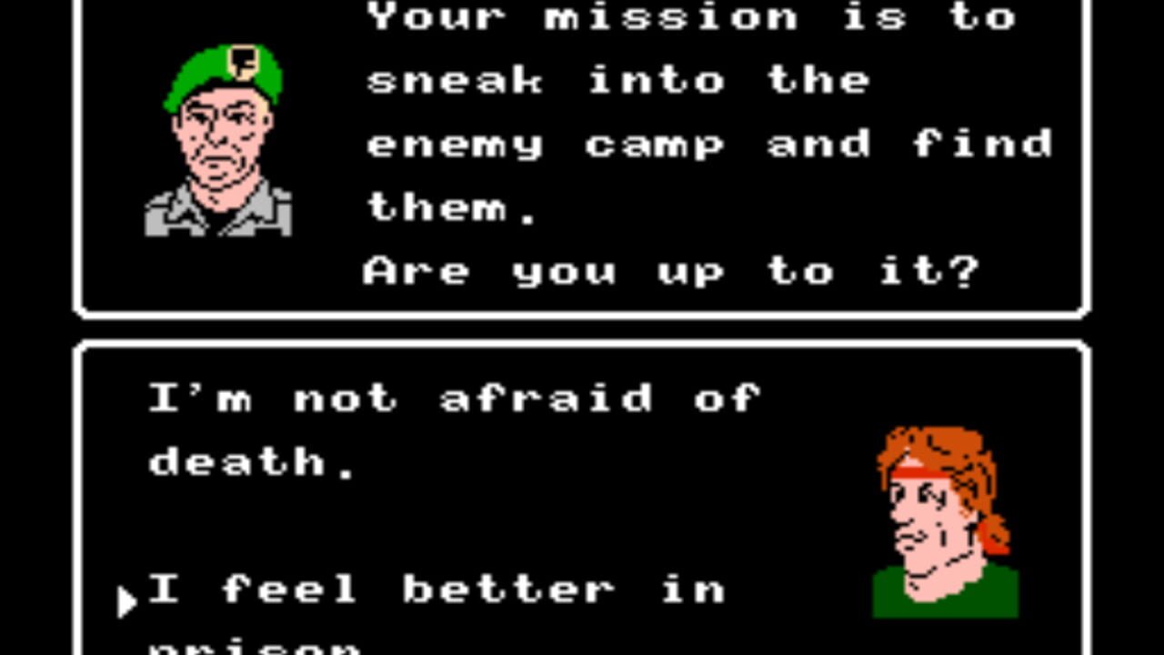 Rambo is a side scrolling platform game where the player controls Rambo with his mission to Vietnam. The game starts at the military base before getting sent to Vietnam. In Vietnam, Rambo has to fight animals in the jungles, swamps, and caves like wasps, snakes, fish, tigers, bats, spiders, birds, apes and flamingos. Before making his way to the POW camp he has to fight guards and mercenaries that can kick and shoot him, all wearing different color shirts depending on how powerful they are. The game also requires the player to navigate a complex map requiring the player to find North and South points on the ground to go up and down levels as well as East and West by moving Rambo to the edge of the screen. There are 6 different weapons that Rambo can pick up that are knife, throwing knife, bow and arrow, bow and exploring arrow, gun, and hand grenade. All the weapons but the knife has limited ammo which is collected from killed enemies. There is also health vile that restores health as well as mission specific items that Rambo must find to complete some missions. The game uses password save that can be retrieved when talking to any person.