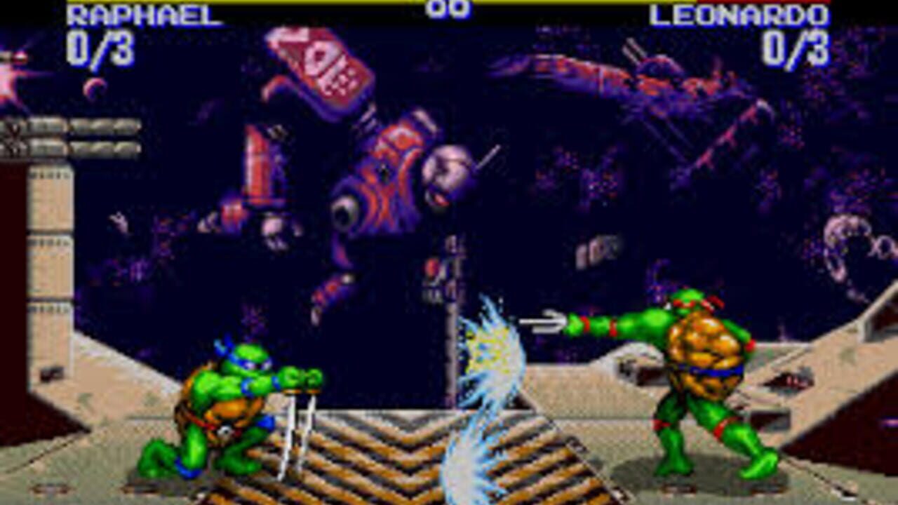 The Genesis version uses the standard three-button controller, with only two buttons for attacking (punch and kick). To perform stronger punches or kicks, the player must hold the directional pad towards the opponent while pressing either attack buttons. The third button is used for taunting. Some of the stages in the game feature destroyable scenery that gives the player and their opponent access to new areas in the stage. As well as their special moves, each character has a 'killer' attack which is only accessible when they are close to death and the red part of the characters' life gauge at the top starts flashing. This is done by pressing the Taunt button in conjunction with a specific D-Pad motion. These moves nearly take out the other character's life gauge completely. The game has eight playable characters, which includes the four Turtles and Casey Jones, as well as April O'Neil (whose active role differs from the versions of the character featured in other games), Ray Fillet (a character from the Teenage Mutant Ninja Turtles Adventures comics), and Sisyphus (an original character, named Musha Beetle in the Japanese version). The player can adjust their power and speed after selecting their character. The music in this version was composed by renowned video game composer Miki Higashino, in collaboration with Masanori Adachi.