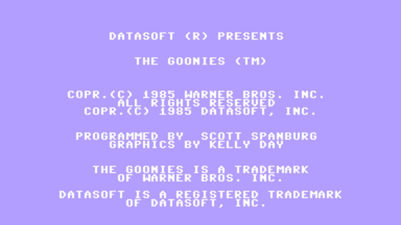 The Goonies is based on the Steven Spielberg film of the same name. The game is divided into a series of eight screens based on scenes from the film, each of which contains puzzles that must be solved by coordinating the activities of two of the kids from the Goonies (and in the last screen, the elephant-man-like Sloth) without getting killed by deadly bats, homicidal Fratellis, flying demon-skull thingies, or other environmental hazards.